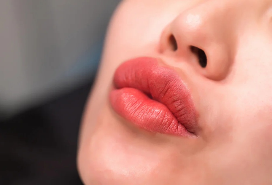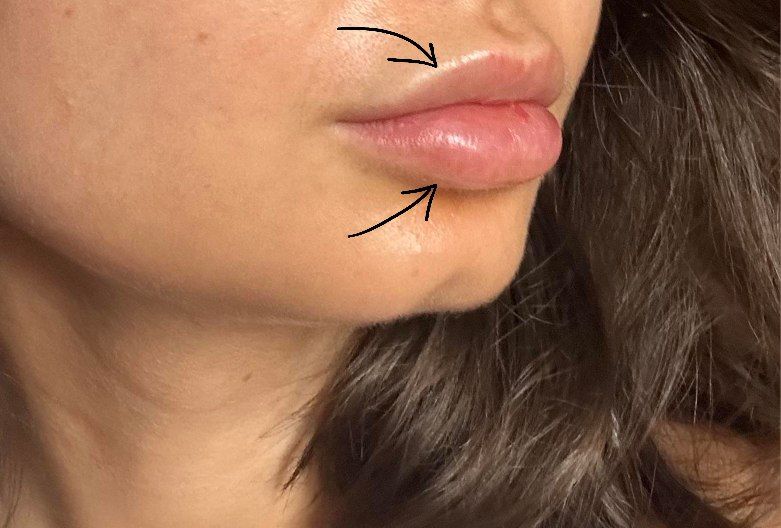 _في الشفتين نلاحظ انتقال المادة إلى فوق الشفة العليا على وجه الخصوص. ويعطي منظراً اسفينياً.