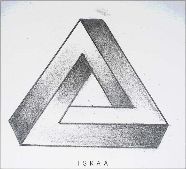 Impossible triangle ? ، المثلث المستحيل اتبع شكل المثلث بدءاً من أعلى نقطة ؛ لاحظ كيف يبدو أن الجانب الأيسر يمتد بعيداً عنك ، ويبدو