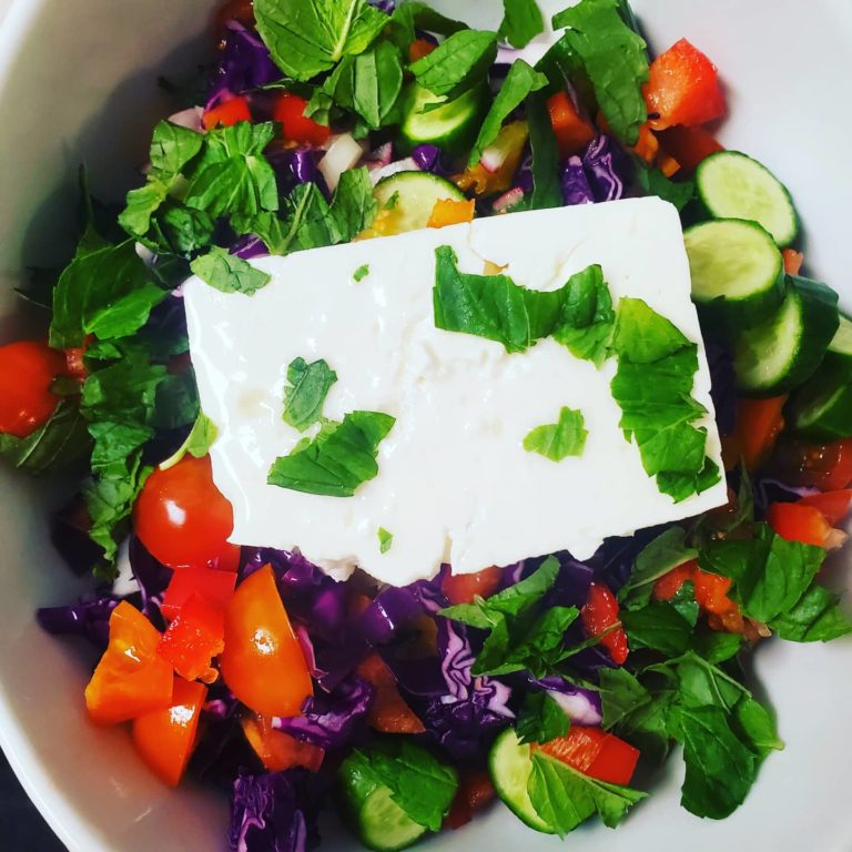 My type of Greek Salad. Try to choose different kind of colorful vegetables, in order to get a variety of phytochemicals for a better gut