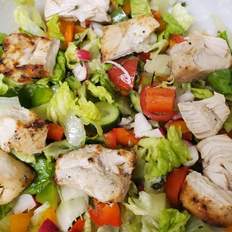 What’s for dinner? Just a colorful salad with whatever vegetables I found in our fridge. Added some left over chicken Kebab (chicken taouk), aka grilled