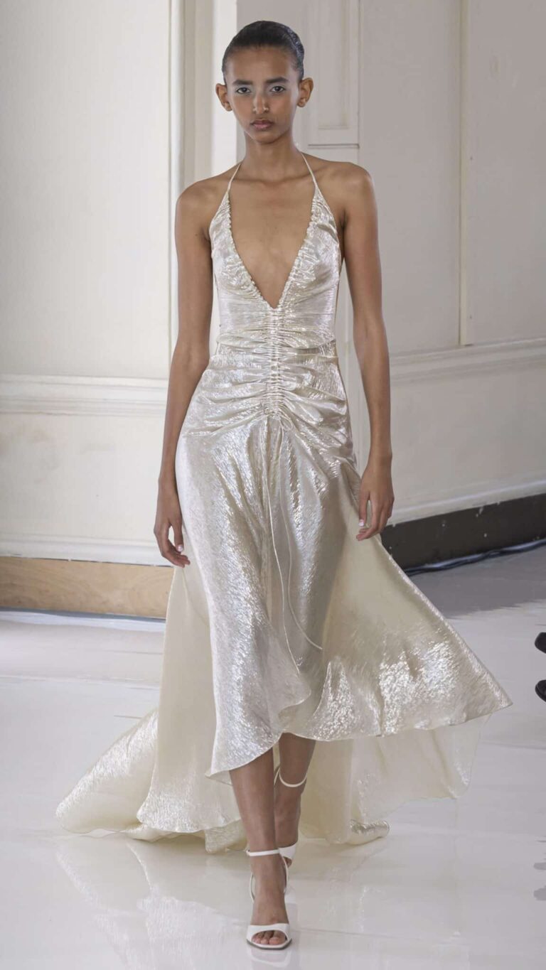 Amir Taghi’s runway debut was one for the books, earning the Iranian-American designer a spot on Women’s Wear Daily’s list of “Ones to Watch” and a feature story in Vogue. This collection deeply featured Taghi’s Persian background, drawing inspiration from 70’s Iran and the current political climate. Each look was highly tailored, pairing suits and jackets with slim pants and structured skirts inspired by the region’s architecture and adorned with Islamic patterns and embellishments. Many looks paired with a scarf or had a flowy element to them, contrasting with the rigidity of the angular pieces. Taghi credits this style to Googoosh, the Iranian singer and collection’s muse, as well as his perception of Iran’s headscarf mandate. The standout piece was an embellished gold lace dress, standing out amongst the orderly sea of neutrals. With his debut, Taghi not only exhibited his technical skill but his cultural literacy in how he presents his art and the concepts that inspired it.